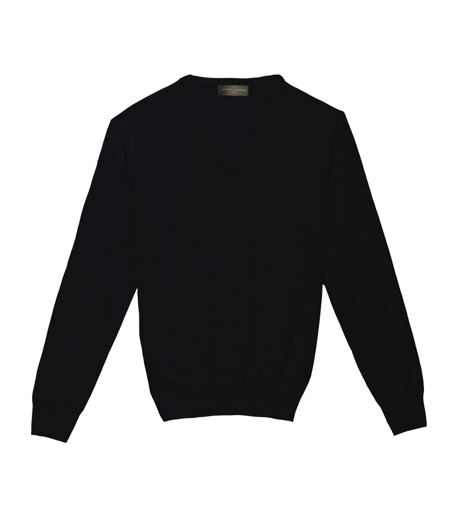 $445A staple refined. This custom V-neck sweater is crafted from 100% extra-fine merino wool in a 12-gauge knit—lightweight enough to layer comfortably under a jacket, yet substantial enough to stand on its own. Spun for softness, breathability, and natural temperature regulation, it’s the kind of piece that earns its keep year-round.
